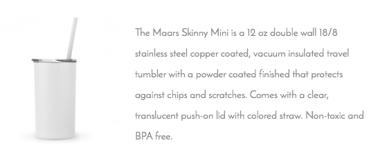 With stainless steel, there aren’t any harmful chemicals that can leach into your drinks. The Skinny Mini and all of our drinkware is 100% BPA free.